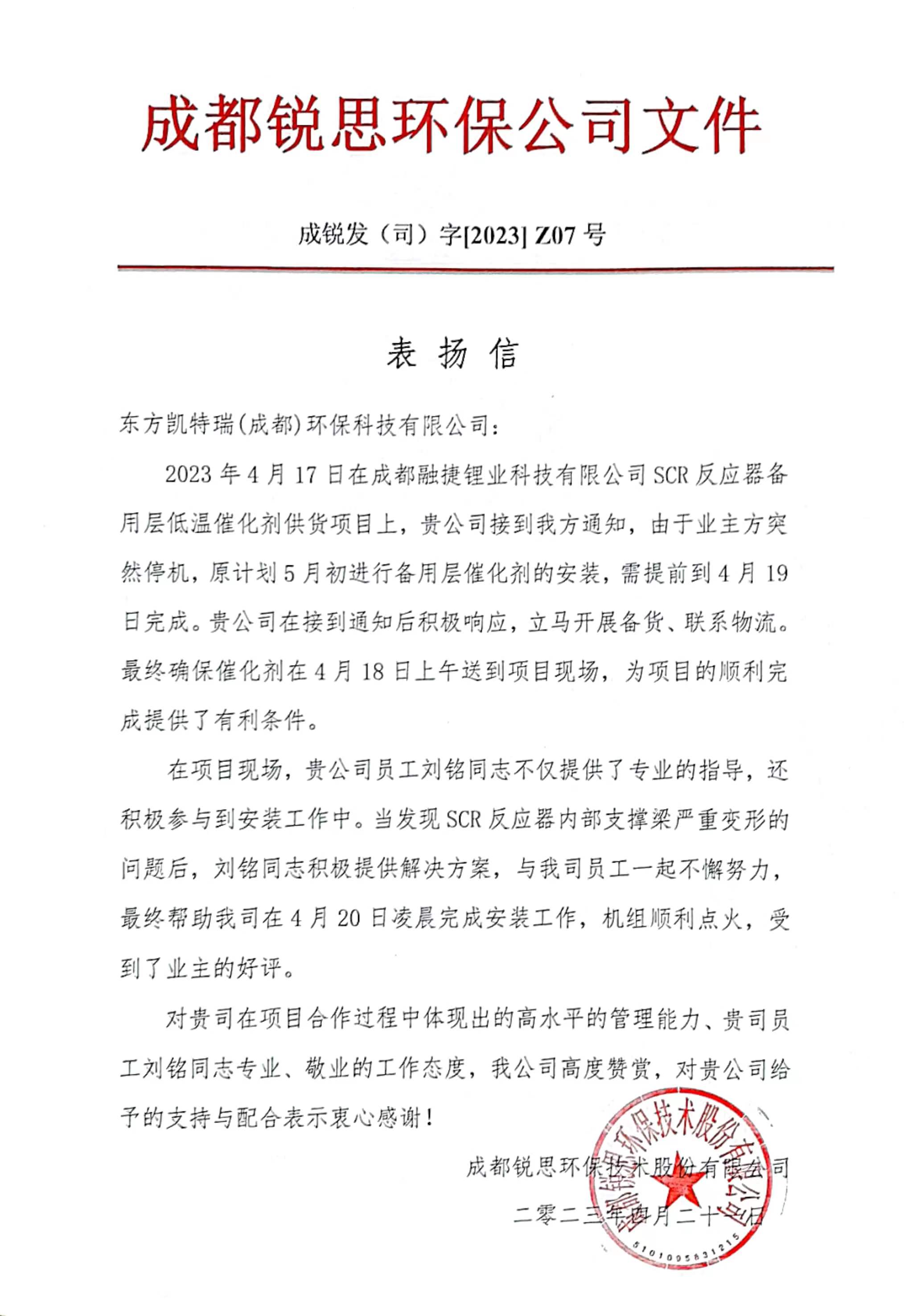 4月17日,接到項目合作方成都銳思環(huán)保技術股份有限公司的通知,由我公司5月上旬供貨的成都融捷鋰業(yè)科技有限公司SCR低溫脫硝催化劑項目,因業(yè)主方設備提前停機需4月19日安裝的要求。 用戶的需求就是命令,接到業(yè)主提前交貨安裝的通知后,急用戶之所急,市場項目部立即行動,項目負責人以最快的速度組織備貨,聯系物流,18日將該項目產品發(fā)運至項目現場。 為了保證工期,做好現場服務,市場項目部安排業(yè)務過硬、責任心強的劉銘同志第一時間趕到現場協(xié)助業(yè)主收貨、驗貨,盡職盡責指導催化劑模塊安裝工作,全程進行技術指導與交底,在過程中發(fā)現并解決了反應器內催化劑支撐梁嚴重變形的技術問題,經過徹夜奮戰(zhàn),于次日上午順利完成安裝任務,最終確保催化劑安裝如期完成,機組順利點火。 本次任務的圓滿完成,充分體現了我公司一切急用戶急,全力為用戶排憂解難的24小時服務精神。項目合作方和業(yè)主對東方凱特瑞在項目合作中展現的高水平管理能力和項目團隊專業(yè)、敬業(yè)且負責的工作態(tài)度給予了高度贊揚,并發(fā)來表揚信表示感謝。