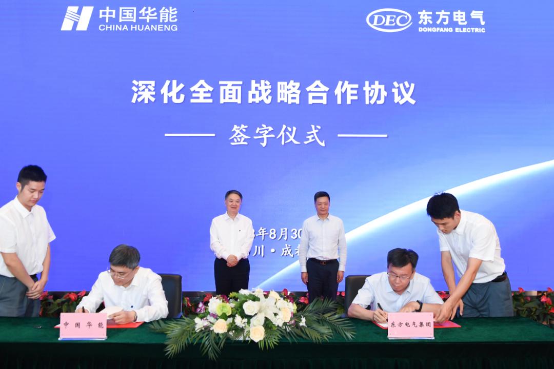 在東方電氣集團(tuán)黨組書記、董事長俞培根,中國華能黨組書記、董事長溫樞剛的共同見證下,東方電氣集團(tuán)黨組成員、副總經(jīng)理李忠軍和中國華能黨組成員、副總經(jīng)理李向良代表雙方簽字。東方電氣集團(tuán)黨組成員、副總經(jīng)理張彥軍出席簽字儀式。