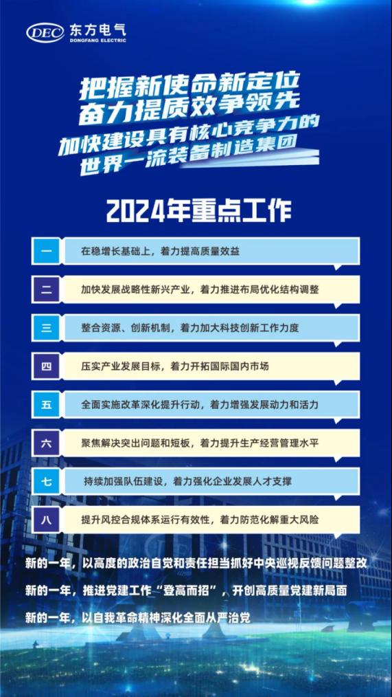 俞培根指出,2024年是落實“領(lǐng)先戰(zhàn)略”和“11256”發(fā)展戰(zhàn)略,推進集團公司轉(zhuǎn)型發(fā)展的關(guān)鍵之年,做好全年的工作尤為重要。全集團要堅持以習近平新時代中國特色社會主義思想為指導,全面貫徹落實黨的二十大和二十屆二中全會、中央經(jīng)濟工作會議精神,深入貫徹落實習近平總書記關(guān)于國有企業(yè)改革發(fā)展和黨的建設(shè)重要論述,認真貫徹落實習近平總書記“弘揚可貴的‘東汽精神’”“做排頭兵、走在前列”的重要要求,把握國資央企新使命新定位,完整、準確、全面貫徹新發(fā)展理念,更好服務(wù)加快構(gòu)建新發(fā)展格局、推進新型工業(yè)化,堅持穩(wěn)中求進、以進促穩(wěn)、先立后破,增強核心功能、提高核心競爭力,落實“領(lǐng)先戰(zhàn)略”,強化創(chuàng)新驅(qū)動,提升經(jīng)濟效益,持續(xù)推動集團公司高質(zhì)量發(fā)展,實現(xiàn)生產(chǎn)經(jīng)營質(zhì)的有效提升和量的合理增長,加快建設(shè)具有核心競爭力的世界一流裝備制造集團。