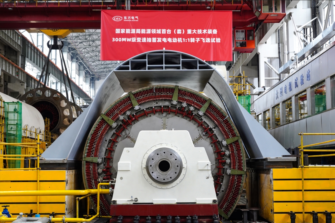本網(wǎng)訊8月16日上午,國家能源局能源領(lǐng)域首臺(套)重大技術(shù)裝備項目——300兆瓦級變速抽水蓄能機組發(fā)電電動機1:1轉(zhuǎn)子,在東方電氣集團東方電機有限公司順利通過飛逸試驗,動態(tài)穩(wěn)定性、可靠性等得到充分驗證,標(biāo)志著我國變速抽水蓄能機組自主研制取得重大突破!