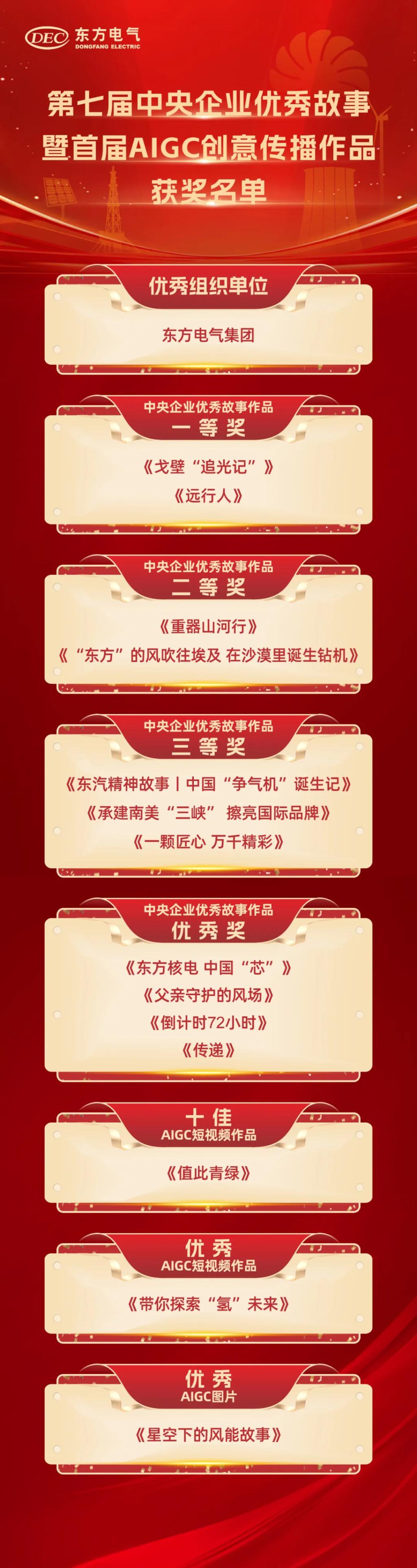 其中,《戈壁“追光記”》《遠行人》榮獲中央企業(yè)優(yōu)秀故事作品一等獎,《重器山河行》《“東方”的風吹往埃及 在沙漠里誕生鉆機》榮獲中央企業(yè)優(yōu)秀故事作品二等獎,《東汽精神故事丨中國“爭氣機”誕生記》《承建南美“三峽”擦亮國際品牌》《一顆匠心 萬千精彩》榮獲中央企業(yè)優(yōu)秀故事作品三等獎,《東方核電 中國“芯”》《父親守護的風場》《倒計時72小時》《傳遞》榮獲中央企業(yè)優(yōu)秀故事作品優(yōu)秀獎,《值此青綠》獲評十佳AIGC短視頻作品,《帶你探索“氫”未來》獲評優(yōu)秀AIGC短視頻作品,《星空下的風能故事》獲評優(yōu)秀AIGC圖片。 活動期間,嘉賓們還參觀了首屆中央企業(yè)AIGC創(chuàng)意傳播成果展,東方電氣集團打造的“能源智造 擎動世界”主題展臺受到關注,集中展出了東方電氣集團綠色智造、AI高端裝備制造的創(chuàng)新形象。
