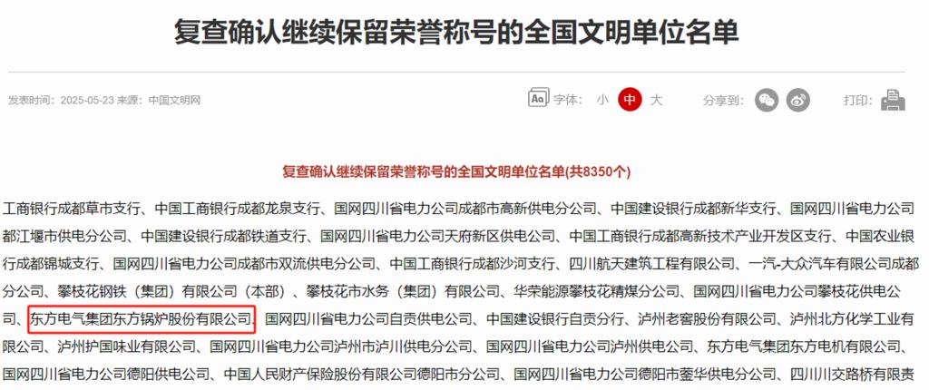 5月23日,中央宣傳思想文化工作領(lǐng)導(dǎo)小組發(fā)布了《中央宣傳思想文化工作領(lǐng)導(dǎo)小組關(guān)于復(fù)查確認(rèn)繼續(xù)保留榮譽(yù)稱號(hào)的全國文明城市、文明村鎮(zhèn)、文明單位、文明家庭、文明校園的通報(bào)》,東方鍋爐位列其中,標(biāo)志著成功通過復(fù)查工作,繼續(xù)保持國家級(jí)文明單位殊榮。