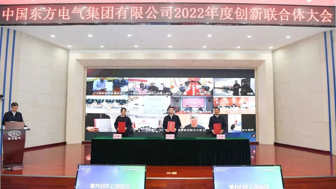 集團(tuán)公司科技信息部負(fù)責(zé)人匯報(bào)了2022年度創(chuàng)新聯(lián)合體工作情況。東方電氣集團(tuán)與12家單位簽署了合作協(xié)議。