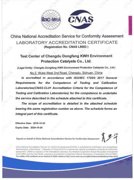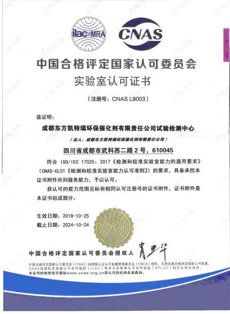 東方凱特瑞試驗檢測中心(以下簡稱中心)成立于2006年,占地面積1500m2,擁有先進的檢測設(shè)備和專業(yè)的人才隊伍,并于2015年10月首次通過中國合格評定國家認(rèn)可委員會認(rèn)可,獲得CNAS證書(證書注冊號:CNAS L8003),認(rèn)可范圍全面覆蓋了催化劑產(chǎn)品全尺寸檢測的所有關(guān)鍵指標(biāo),可為客戶提供高效和專業(yè)的技術(shù)檢測服務(wù)。
